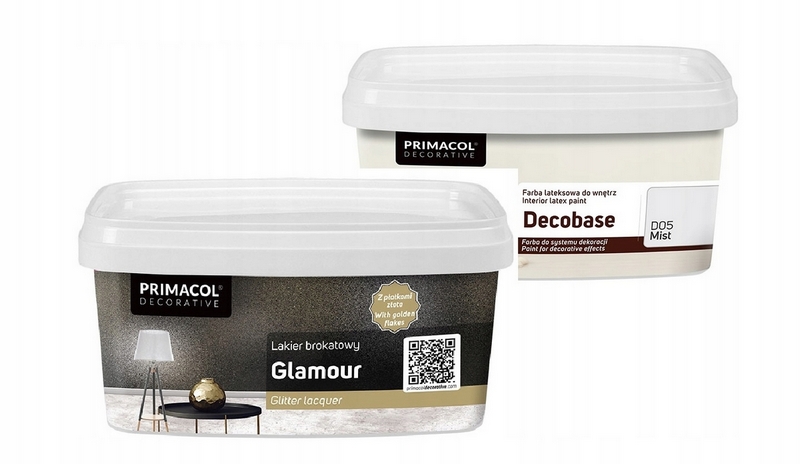 Lakier brokatowy Glamour Primacol decorative to transparentna, matowa powłoka dekoracyjno-ochronna z efektem połyskujących płatków złota z akcentem srebrnych drobinek. Zastosowanie lakieru pozwala uzyskać spektakularny efekt w nowych wnętrzach lub ożywić stare i nudne ściany. Oprócz właściwości dekoracyjnych uzyskana powłoka jest odporna na zmywanie. Lakier można też stosować jako dodatkową ozdobę ścian wykończonych przy użyciu past strukturalnych.
