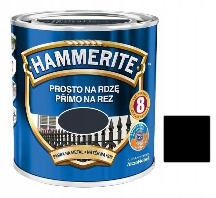 Hammerite Prosto Na Rdzę to nowoczesna, jednoskładnikowa farba, schnąca na powietrzu, przeznaczona do antykorozyjnego i dekoracyjnego malowania metali żelaznych (stal, żeliwo), zarówno tych pokrytych rdzą, jak i czystych. Może być również stosowana do zabezpieczenia metali nieżelaznych po odpowiednim zagruntowaniu. Wykończenie w efekcie gładki połysk zapewnia niepowtarzalne walory estetyczne i długotrwałą ochronę antykorozyjną.