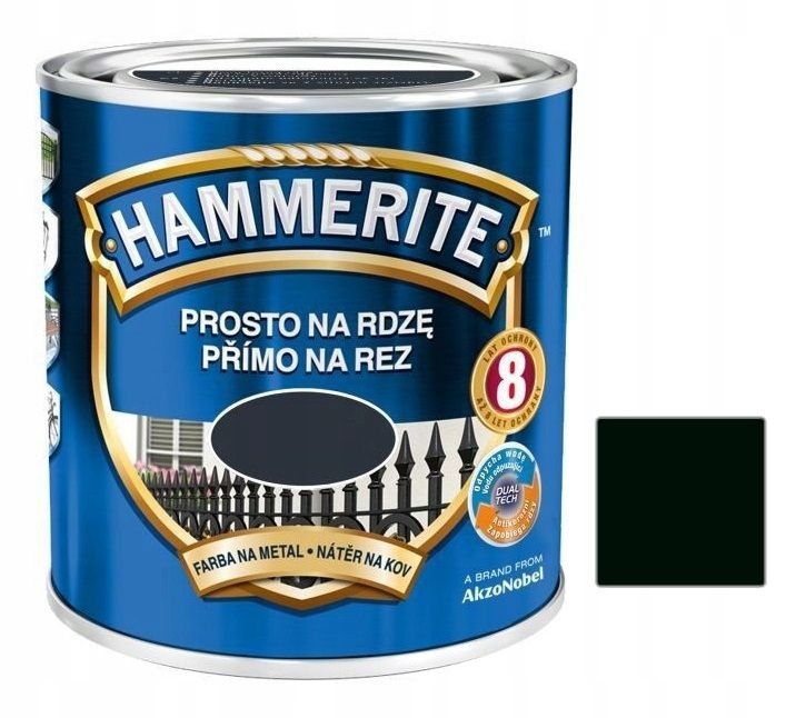 Hammerite Prosto Na Rdzę to nowoczesna, jednoskładnikowa farba, schnąca na powietrzu, przeznaczona do antykorozyjnego i dekoracyjnego malowania metali żelaznych (stal, żeliwo), zarówno tych pokrytych rdzą, jak i czystych. Może być również stosowana do zabezpieczenia metali nieżelaznych po odpowiednim zagruntowaniu. Wykończenie w efekcie gładki połysk zapewnia niepowtarzalne walory estetyczne i długotrwałą ochronę antykorozyjną.