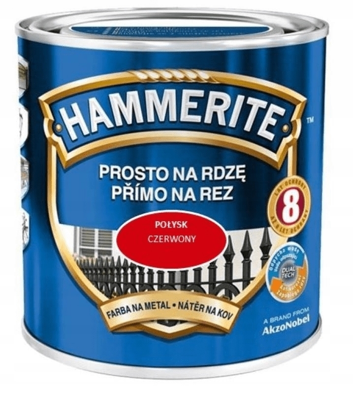 Hammerite Prosto Na Rdzę – połysk – to nowoczesna, jednoskładnikowa farba, schnąca na powietrzu, przeznaczona do antykorozyjnego i dekoracyjnego malowania metali żelaznych (stal, żeliwo), zarówno tych pokrytych rdzą, jak i czystych. Może być również stosowana do zabezpieczenia metali nieżelaznych po odpowiednim zagruntowaniu. Wykończenie w efekcie gładki połysk zapewnia niepowtarzalne walory estetyczne i długotrwałą ochronę antykorozyjną.