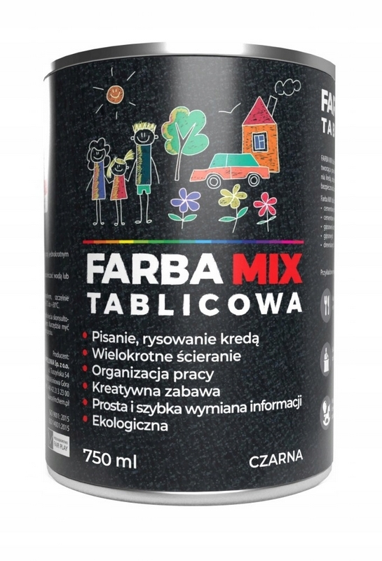 FARBA MIX tablicowa to wodorozcieńczalna, uniwersalna farba tworząca powłoki o efekcie tablicy szkolnej, idealna do pisania kredą, odporna na wielokrotne zmywanie. Jest całkowicie bezpieczna dla otoczenia.