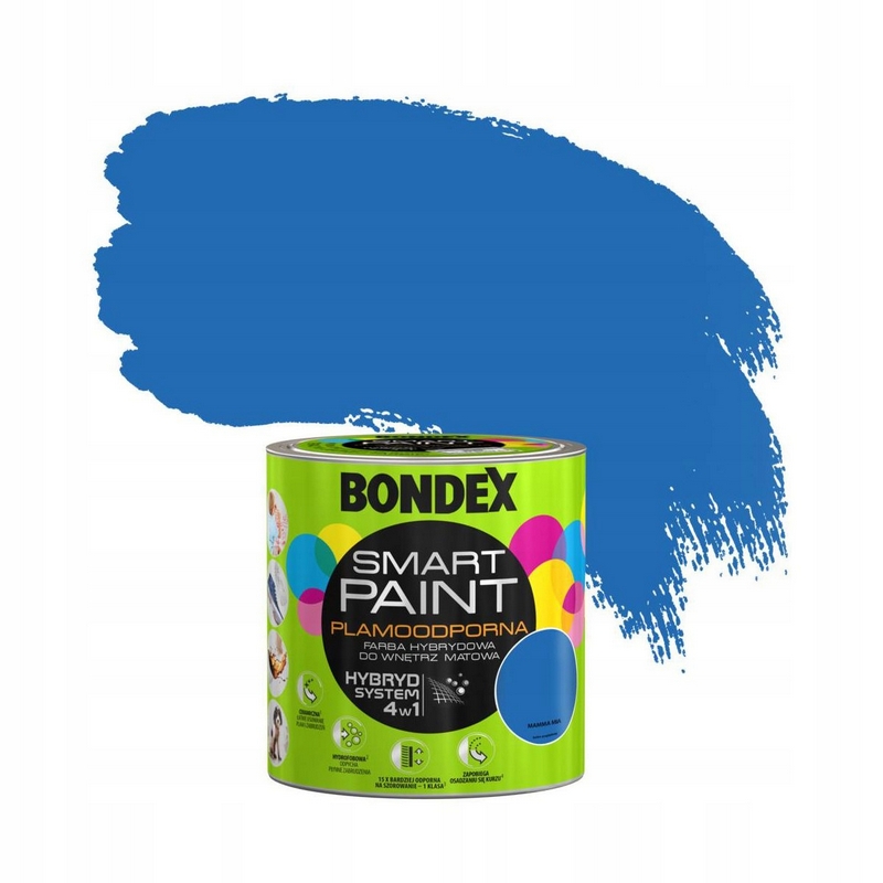 Bondex Smart Paint to najwyższej jakości plamoodporna farba hybrydowa o matowym efekcie wykończenia z innowacyjną formułą HYBRYD SYSTEM 4w1. Synergiczne połączenie wysokogatunkowej dyspersji akrylowej, wysokiej jakości wosków i kombinacji innowacyjnych wypełniaczy sferycznych zapewnia ponadprzeciętne właściwości aplikacyjne i użytkowe oraz niespotykaną odporność na zabrudzenia i plamy.Farba Bondex Smart Paint przeznaczona jest do malowania ścian i sufitów wewnątrz pomieszczeń. Ze względu na swoje właściwości plamoodporne, szczególnie polecana jest do malowania pomieszczeń narażonych na zabrudzenia – ciągi komunikacyjne, korytarze, pomieszczenia prywatne i biurowe, salony i jadalnie oraz pokoje dziecięce a także w obiektach użyteczności publicznej, takich jak szkoły, przedszkola, hotele oraz w branży gastronomicznej i przemyśle spożywczym. Farba jest także idealna do malowania kuchni.