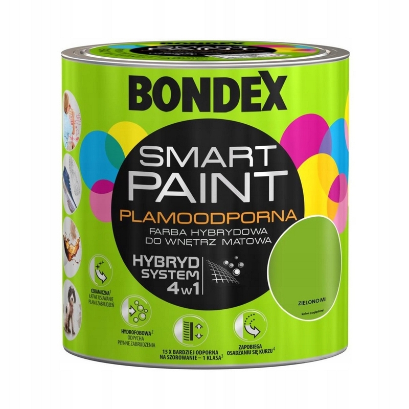 Bondex Smart Paint to najwyższej jakości plamoodporna farba hybrydowa o matowym efekcie wykończenia z innowacyjną formułą HYBRYD SYSTEM 4w1. Synergiczne połączenie wysokogatunkowej dyspersji akrylowej, wysokiej jakości wosków i kombinacji innowacyjnych wypełniaczy sferycznych zapewnia ponadprzeciętne właściwości aplikacyjne i użytkowe oraz niespotykaną odporność na zabrudzenia i plamy.Farba Bondex Smart Paint przeznaczona jest do malowania ścian i sufitów wewnątrz pomieszczeń. Ze względu na swoje właściwości plamoodporne, szczególnie polecana jest do malowania pomieszczeń narażonych na zabrudzenia – ciągi komunikacyjne, korytarze, pomieszczenia prywatne i biurowe, salony i jadalnie oraz pokoje dziecięce a także w obiektach użyteczności publicznej, takich jak szkoły, przedszkola, hotele oraz w branży gastronomicznej i przemyśle spożywczym. Farba jest także idealna do malowania kuchni.