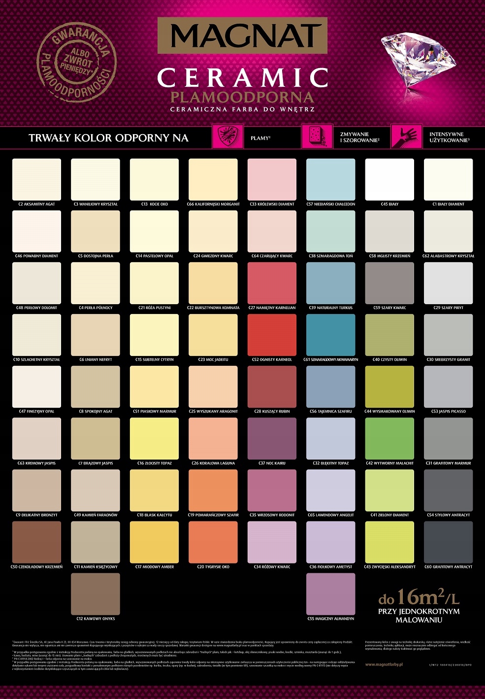 Magnat CERAMIC to farba 3. generacji, którą wyprodukowano z wykorzystaniem innowacyjnej technologii CERAMIC SYSTEM, którabazuje na ceramicznych komponentach oraz najwyższej jakości żywicach i pigmentach. Ta unikalna formuła zapewnia farbie MAGNAT CERAMIC ponadprzeciętne parametry odporności na szorowanie i wielokrotne zmywanie oraz sprawia, że powłoki farby nie absorbują zabrudzeń i szczególnych plam.