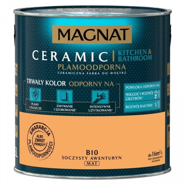 MAGNAT Ceramic Kitchen&Bathroom to ceramiczna farba tworząca powłoki o hydrofobowych właściwościach, która polecana jest szczególnie do dekoracyjnoochronnego malowania ścian i sufitów wewnątrz pomieszczeń narażonych na okresowo zwiększające się zawilgocenie i kondensację pary wodnej, jak: łazienki, pralnie czy kuchnie. Produkt ponadto charakteryzuje się ponadprzeciętnymi parametrami odporności na plamy, ścieranie oraz odpornością na środki dezynfekujące. Pomalowane nią ściany na długo pozostają czyste, a ich kolor wyrazisty i świeży.