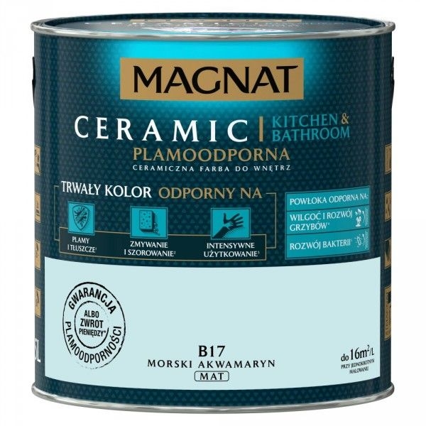 MAGNAT Ceramic Kitchen&Bathroom to ceramiczna farba tworząca powłoki o hydrofobowych właściwościach, która polecana jest szczególnie do dekoracyjnoochronnego malowania ścian i sufitów wewnątrz pomieszczeń narażonych na okresowo zwiększające się zawilgocenie i kondensację pary wodnej, jak: łazienki, pralnie czy kuchnie. Produkt ponadto charakteryzuje się ponadprzeciętnymi parametrami odporności na plamy, ścieranie oraz odpornością na środki dezynfekujące. Pomalowane nią ściany na długo pozostają czyste, a ich kolor wyrazisty i świeży.