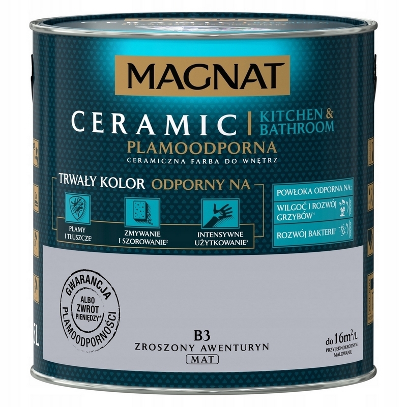 MAGNAT Ceramic Kitchen&Bathroom powstała w odpowiedzi na wasze potrzeby pomalowania kuchni i łazienki wysokiej jakości farbą, która tworzy ceramiczne powłoki o hydrofobowych właściwościach. Polecana jest szczególnie do dekoracyjnoochronnego malowania ścian i sufitów wewnątrz pomieszczeń narażonych na okresowo zwiększające się zawilgocenie i kondensację pary wodnej, jak: łazienki, pralnie czy kuchnie. Produkt ponadto charakteryzuje się ponadprzeciętnymi parametrami odporności na plamy, ścieranie oraz odpornością na środki dezynfekujące. Pomalowane nią ściany na długo pozostają czyste, a ich kolor wyrazisty i świeży. Niniejsza farba Farba przeznaczona jest do dekoracyjnoochronnego malowania ścian i sufitów cementowych, cementowo-wapiennych, gipsowych, gipsowo-kartonowych oraz tapet z włókna szklanego. Może być również stosowana w pomieszczeniach narażonych na okresowe działanie wilgoci (łazienki, pralnie, kuchnie itp.) na podłoża drewniane, drewnopochodne, metalowe. Polecana do malowania pomieszczeń: mieszkalnych, przeznaczonych na stały pobyt chorych w budynkach służby zdrowia, a także dzieci i młodzieży w budynkach oświaty oraz miejsc do przechowywania produktów żywnościowych (bez bezpośredniego kontaktu z żywnością).