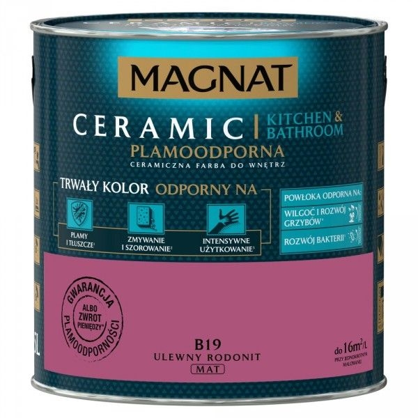 Magnat Ceramic - ceramiczna, plamoodporna farba do kuchni i łazienki w kolorze B19 Ulewny Rodonit w opakowaniu 2.5L