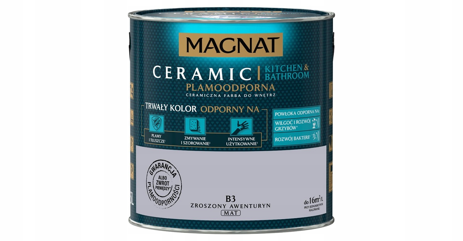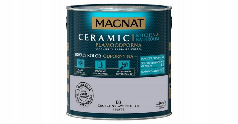 Emulsja Kitchen Bathroom w kolorze burzliwy hematyt to ceramiczna farba tworząca powłoki o hydrofobowych właściwościach, która polecana jest szczególnie do dekoracyjno - ochronnego malowania ścian i sufitów wewnątrz pomieszczeń narażonych na okresowo zwiększające się zawilgocenie i kondensację pary wodnej, jak: łazienki, pralnie czy kuchnie. Produkt ponadto charakteryzuje się ponadprzeciętnymi parametrami odporności na plamy, ścieranie oraz odpornością na środki dezynfekujące. Pomalowane nią ściany na długo pozostają czyste, a ich kolor wyrazisty i świeży.