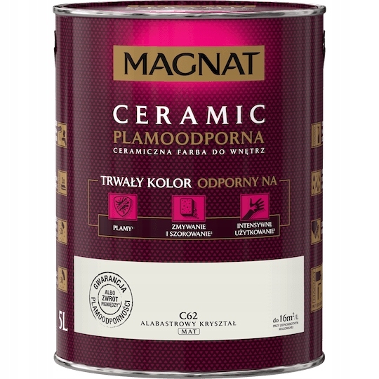 to plamoodporna farba ceramiczna, stworzona na bazie najwyższej jakości żywic i pigmentów z myślą o najbardziej wymagających odbiorcach. Charakteryzuje się ponadprzeciętną odpornością na szorowanie i wielokrotne zmywanie. Powłoki nie absorbują trudnych zabrudzeń oraz są odporne na środki dezynfekujące. Produkt zapewnia doskonałe krycie i wydajność, nie chlapie podczas malowania. MAGNAT Ceramic zapewnia trwałe kolory odporne nawet na intensywną eksploatację i „trudne” plamy, takie jak: ketchup, olej słonecznikowy, pisaki wodne, kredki, szminka, musztarda (usunąć do 1 godziny), kawa, herbata, wino (usunąć do 15 minut) 1. Powłoki farby można zmywać i szorować na mokro2, również przy użyciu niektórych dezynfektantów3. ¹ Badania przeprowadzono po 28 dniach na gładkich, wysezonowanych podłożach dla wymienionych rodzajów plam po upływie wskazanych czasów. Producent zapewnia efekt plamoodporności¹ na gładkich powierzchniach.