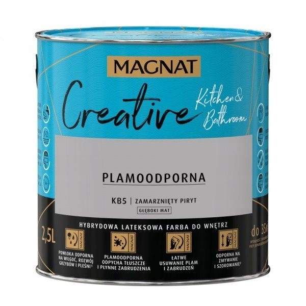 MAGNAT Creative Kitchen&Bathroom to lateksowa farba tworząca powłoki o hydrofobowych i oleofobowych właściwościach. Farba polecana jest szczególnie do dekoracyjnoochronnego malowania ścian i sufitów wewnątrz pomieszczeń narażonych na okresowo zwiększające się zawilgocenie i kondensację pary wodnej, jak: łazienki, pralnie czy kuchnie.