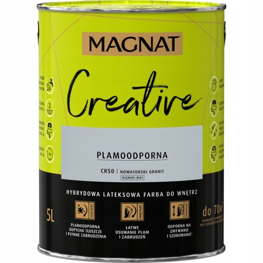 MAGNAT CREATIVE to farba hybrydowa, łącząca ze sobą dwie właściwości: odporność na płynne zabrudzenia (hydrofobowość ) oraz odporność na tłuszcze (oleofobowość). Głęboko matowe wykończenie podkreśla głębię koloru, ale oznacza również antyrefleksyjność farby. Farba przeznaczona jest do dekoracyjno-ochronnego malowania ścian i sufitów z zapraw cementowych, cementowo-wapiennych, gipsowych, cegły, płyt gipsowo-kartonowych, drewnianych, drewnopochodnych oraz tapet, również tych z włókna szklanego użytkowanych wewnątrz pomieszczeń.