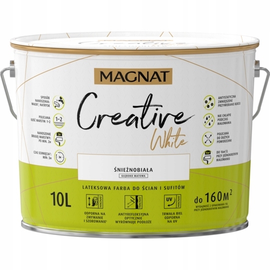 MAGNAT Creative White to lateksowa farba do aranżacji wnętrz o głęboko matowym wykończeniu, odporna na szorowanie i zmywanie na mokro, łatwa w użyciu – nie chlapie podczas malowania i charakteryzuje się bardzo dobrą przyczepnością do podłoża. Gwarantuje trwałą biel odporną na działanie UV. Tworzy antyrefleksyjne i antystatyczne powłoki, dzięki czemu do ścian przywiera mniej kurzu. Sprawdzi się doskonale do malowania dużych powierzchni.