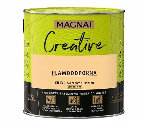 Emulsja Creative o pojemności 2,5 l, marki Magnat to farba hybrydowa, łącząca ze sobą dwie właściwości: odporność na płynne zabrudzenia (hydrofobowość ) oraz odporność na tłuszcze (oleofobowość). Farba przeznaczona jest do dekoracyjnoochronnego malowania ścian i sufitów z zapraw cementowych, cementowowapiennych, gipsowych, cegły, płyt gipsowokartonowych, drewnianych, drewnopochodnych oraz tapet, również tych z włókna szklanego użytkowanych wewnątrz pomieszczeń.