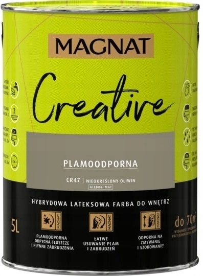 MAGNAT CREATIVE to farba hybrydowa, łącząca ze sobą dwie właściwości: odporność na płynne zabrudzenia (hydrofobowość ) oraz odporność na tłuszcze (oleofobowość). Głęboko matowe wykończenie podkreśla głębię koloru, ale oznacza również antyrefleksyjność farby. Farba przeznaczona jest do dekoracyjno-ochronnego malowania ścian i sufitów z zapraw cementowych, cementowo-wapiennych, gipsowych, cegły, płyt gipsowo-kartonowych, drewnianych, drewnopochodnych oraz tapet, również tych z włókna szklanego użytkowanych wewnątrz pomieszczeń.