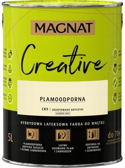MAGNAT CREATIVE to farba hybrydowa, łącząca ze sobą dwie właściwości: odporność na płynne zabrudzenia (hydrofobowość ) oraz odporność na tłuszcze (oleofobowość). Głęboko matowe wykończenie podkreśla głębię koloru, ale oznacza również antyrefleksyjność farby. Farba przeznaczona jest do dekoracyjno-ochronnego malowania ścian i sufitów z zapraw cementowych, cementowo-wapiennych, gipsowych, cegły, płyt gipsowo-kartonowych, drewnianych, drewnopochodnych oraz tapet, również tych z włókna szklanego użytkowanych wewnątrz pomieszczeń.