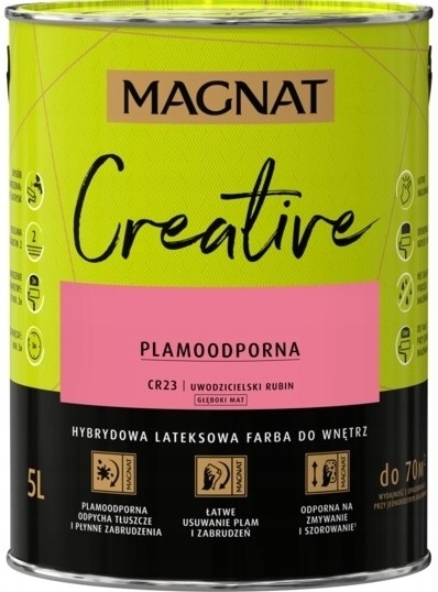 MAGNAT CREATIVE to farba hybrydowa, łącząca ze sobą dwie właściwości: odporność na płynne zabrudzenia (hydrofobowość ) oraz odporność na tłuszcze (oleofobowość). Głęboko matowe wykończenie podkreśla głębię koloru, ale oznacza również antyrefleksyjność farby. Farba przeznaczona jest do dekoracyjno-ochronnego malowania ścian i sufitów z zapraw cementowych, cementowo-wapiennych, gipsowych, cegły, płyt gipsowo-kartonowych, drewnianych, drewnopochodnych oraz tapet, również tych z włókna szklanego użytkowanych wewnątrz pomieszczeń.