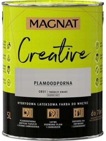 MAGNAT CREATIVE to farba hybrydowa, łącząca ze sobą dwie właściwości: odporność na płynne zabrudzenia (hydrofobowość ) oraz odporność na tłuszcze (oleofobowość). Głęboko matowe wykończenie podkreśla głębię koloru, ale oznacza również antyrefleksyjność farby. Farba przeznaczona jest do dekoracyjno-ochronnego malowania ścian i sufitów z zapraw cementowych, cementowo-wapiennych, gipsowych, cegły, płyt gipsowo-kartonowych, drewnianych, drewnopochodnych oraz tapet, również tych z włókna szklanego użytkowanych wewnątrz pomieszczeń.