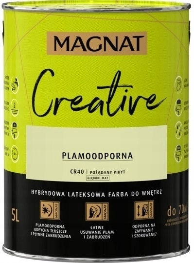 MAGNAT CREATIVE to farba hybrydowa, łącząca ze sobą dwie właściwości: odporność na płynne zabrudzenia (hydrofobowość ) oraz odporność na tłuszcze (oleofobowość). Głęboko matowe wykończenie podkreśla głębię koloru, ale oznacza również antyrefleksyjność farby. Farba przeznaczona jest do dekoracyjno-ochronnego malowania ścian i sufitów z zapraw cementowych, cementowo-wapiennych, gipsowych, cegły, płyt gipsowo-kartonowych, drewnianych, drewnopochodnych oraz tapet, również tych z włókna szklanego użytkowanych wewnątrz pomieszczeń.