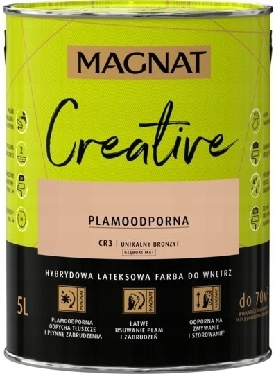 MAGNAT CREATIVE to farba hybrydowa, łącząca ze sobą dwie właściwości: odporność na płynne zabrudzenia (hydrofobowość ) oraz odporność na tłuszcze (oleofobowość). Głęboko matowe wykończenie podkreśla głębię koloru, ale oznacza również antyrefleksyjność farby. Farba przeznaczona jest do dekoracyjno-ochronnego malowania ścian i sufitów z zapraw cementowych, cementowo-wapiennych, gipsowych, cegły, płyt gipsowo-kartonowych, drewnianych, drewnopochodnych oraz tapet, również tych z włókna szklanego użytkowanych wewnątrz pomieszczeń.