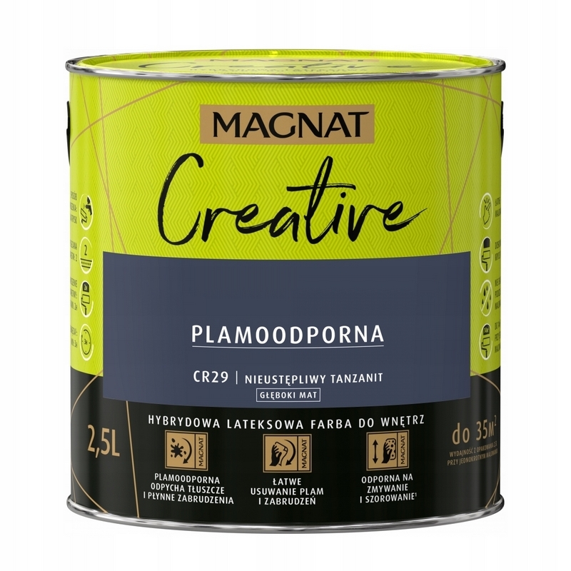 MAGNAT Creative, która wzbogaciła ofertę rozwiązań marki MAGNAT, to wysokiej jakości, plamoodporna, lateksowa farba hybrydowa o głęboko matowym wykończeniu, które podkreśla głębię koloru. Produkt jest ponadto łatwy w użyciu – nie chlapie, dobrze kryje i ma doskonałą przyczepność do podłoża, a przy tym szybko schnie, a więc ściany można bez trudu wymalować samodzielnie.