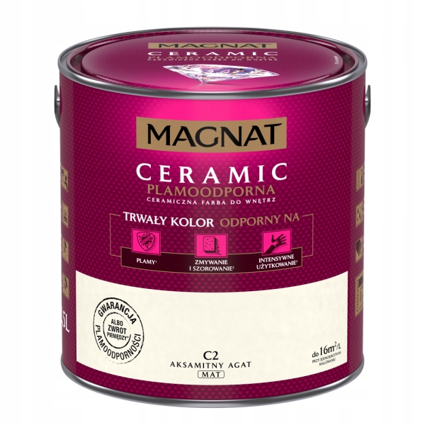 MAGNAT Ceramic to ceramiczna farba do wnętrz, 3. generacji bazująca na ceramicznych komponentach oraz najwyższej jakości żywicach i pigmentach. Ta unikalna formuła zapewnia farbie MAGNAT ponadprzeciętne parametry odporności na szorowanie i wielokrotne zmywanie oraz sprawia, że powłoki farby nie absorbują zabrudzeń i „trudnych” plam oraz są odporne na dezynfektanty. Zapewnia to uzyskanie wyjątkowej trwałości powłoki i kolorów.