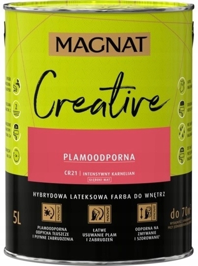 MAGNAT CREATIVE to farba hybrydowa, łącząca ze sobą dwie właściwości: odporność na płynne zabrudzenia (hydrofobowość ) oraz odporność na tłuszcze (oleofobowość). Głęboko matowe wykończenie podkreśla głębię koloru, ale oznacza również antyrefleksyjność farby. Farba przeznaczona jest do dekoracyjno-ochronnego malowania ścian i sufitów z zapraw cementowych, cementowo-wapiennych, gipsowych, cegły, płyt gipsowo-kartonowych, drewnianych, drewnopochodnych oraz tapet, również tych z włókna szklanego użytkowanych wewnątrz pomieszczeń.