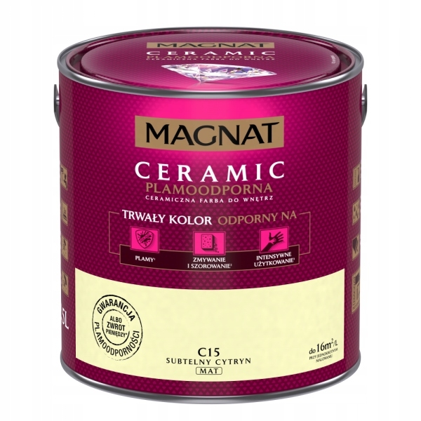 MAGNAT Ceramic to ceramiczna farba do wnętrz, 3. generacji bazująca na ceramicznych komponentach oraz najwyższej jakości żywicach i pigmentach. Ta unikalna formuła zapewnia farbie MAGNAT ponadprzeciętne parametry odporności na szorowanie i wielokrotne zmywanie oraz sprawia, że powłoki farby nie absorbują zabrudzeń i „trudnych” plam oraz są odporne na dezynfektanty. Zapewnia to uzyskanie wyjątkowej trwałości powłoki i kolorów.