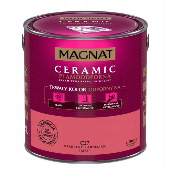 MAGNAT Ceramic to ceramiczna farba do wnętrz, 3. generacji bazująca na ceramicznych komponentach oraz najwyższej jakości żywicach i pigmentach. Ta unikalna formuła zapewnia farbie MAGNAT ponadprzeciętne parametry odporności na szorowanie i wielokrotne zmywanie oraz sprawia, że powłoki farby nie absorbują zabrudzeń i „trudnych” plam oraz są odporne na dezynfektanty. Zapewnia to uzyskanie wyjątkowej trwałości powłoki i kolorów.