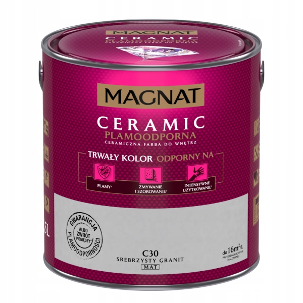 MAGNAT Ceramic to ceramiczna farba do wnętrz, 3. generacji bazująca na ceramicznych komponentach oraz najwyższej jakości żywicach i pigmentach. Ta unikalna formuła zapewnia farbie MAGNAT ponadprzeciętne parametry odporności na szorowanie i wielokrotne zmywanie oraz sprawia, że powłoki farby nie absorbują zabrudzeń i „trudnych” plam oraz są odporne na dezynfektanty. Zapewnia to uzyskanie wyjątkowej trwałości powłoki i kolorów.