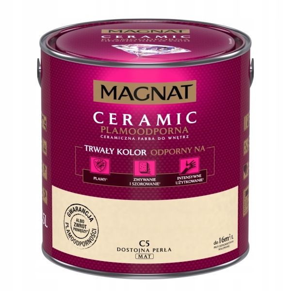 MAGNAT Ceramic to ceramiczna farba do wnętrz, 3. generacji bazująca na ceramicznych komponentach oraz najwyższej jakości żywicach i pigmentach. Ta unikalna formuła zapewnia farbie MAGNAT ponadprzeciętne parametry odporności na szorowanie i wielokrotne zmywanie oraz sprawia, że powłoki farby nie absorbują zabrudzeń i „trudnych” plam oraz są odporne na dezynfektanty. Zapewnia to uzyskanie wyjątkowej trwałości powłoki i kolorów.