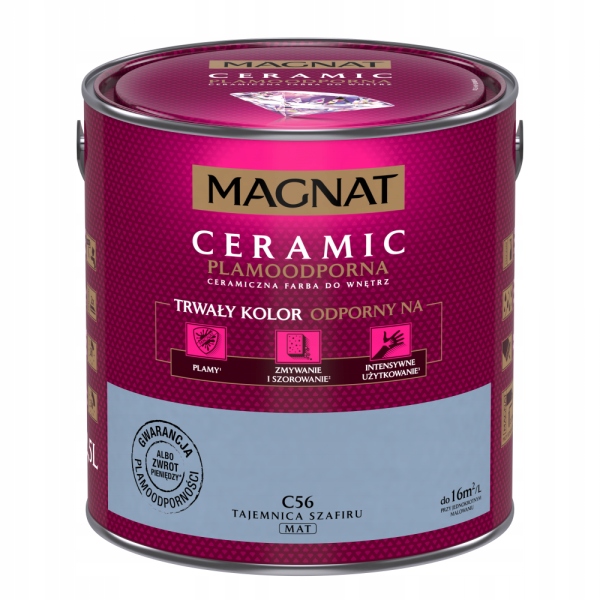 MAGNAT Ceramic to ceramiczna farba do wnętrz, 3. generacji bazująca na ceramicznych komponentach oraz najwyższej jakości żywicach i pigmentach. Ta unikalna formuła zapewnia farbie MAGNAT ponadprzeciętne parametry odporności na szorowanie i wielokrotne zmywanie oraz sprawia, że powłoki farby nie absorbują zabrudzeń i „trudnych” plam oraz są odporne na dezynfektanty. Zapewnia to uzyskanie wyjątkowej trwałości powłoki i kolorów.
