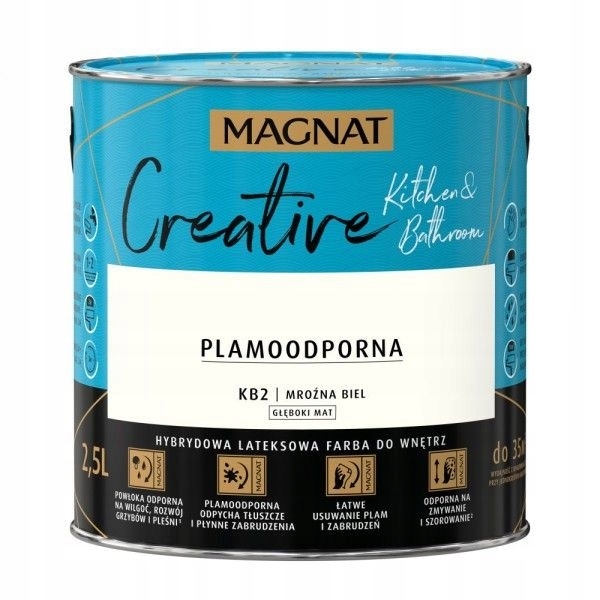 MAGNAT Creative Kitchen&Bathroom to lateksowa farba tworząca powłoki o hydrofobowych i oleofobowych właściwościach. Farba polecana jest szczególnie do dekoracyjnoochronnego malowania ścian i sufitów wewnątrz pomieszczeń narażonych na okresowo zwiększające się zawilgocenie i kondensację pary wodnej, jak: łazienki, pralnie czy kuchnie.