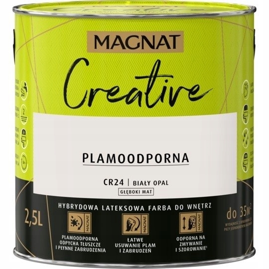 Magnat Creative to farba hybrydowa, łącząca ze sobą dwie właściwości: odporność na płynne zabrudzenia (hydrofobowość) oraz odporność na tłuszcze (oleofobowość). Farba przeznaczona jest do dekoracyjnoochronnego malowania ścian i sufitów z zapraw cementowych, cementowowapiennych, gipsowych, cegły, płyt gipsowokartonowych, drewnianych, drewnopochodnych oraz tapet, również tych z włókna szklanego użytkowanych wewnątrz pomieszczeń.