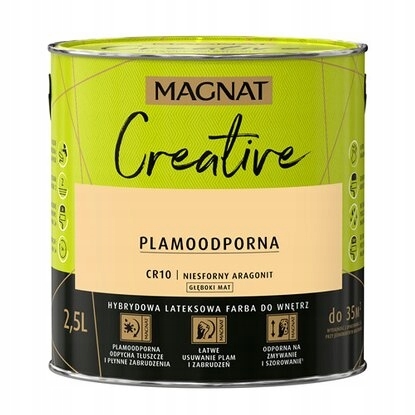 Magnat Creative to farba hybrydowa, łącząca ze sobą dwie właściwości: odporność na płynne zabrudzenia (hydrofobowość) oraz odporność na tłuszcze (oleofobowość). Farba przeznaczona jest do dekoracyjnoochronnego malowania ścian i sufitów z zapraw cementowych, cementowowapiennych, gipsowych, cegły, płyt gipsowokartonowych, drewnianych, drewnopochodnych oraz tapet, również tych z włókna szklanego użytkowanych wewnątrz pomieszczeń.