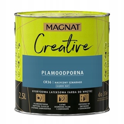 Magnat Creative to farba hybrydowa, łącząca ze sobą dwie właściwości: odporność na płynne zabrudzenia (hydrofobowość) oraz odporność na tłuszcze (oleofobowość). Farba przeznaczona jest do dekoracyjnoochronnego malowania ścian i sufitów z zapraw cementowych, cementowowapiennych, gipsowych, cegły, płyt gipsowokartonowych, drewnianych, drewnopochodnych oraz tapet, również tych z włókna szklanego użytkowanych wewnątrz pomieszczeń.