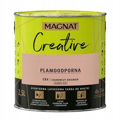 Magnat Creative to farba hybrydowa, łącząca ze sobą dwie właściwości: odporność na płynne zabrudzenia (hydrofobowość) oraz odporność na tłuszcze (oleofobowość). Farba przeznaczona jest do dekoracyjnoochronnego malowania ścian i sufitów z zapraw cementowych, cementowowapiennych, gipsowych, cegły, płyt gipsowokartonowych, drewnianych, drewnopochodnych oraz tapet, również tych z włókna szklanego użytkowanych wewnątrz pomieszczeń.