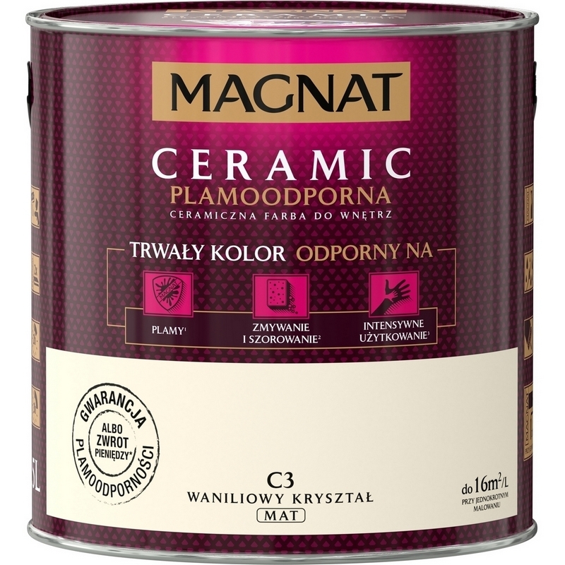 to plamoodporna farba ceramiczna, stworzona na bazie najwyższej jakości żywic i pigmentów z myślą o najbardziej wymagających odbiorcach. Charakteryzuje się ponadprzeciętną odpornością na szorowanie i wielokrotne zmywanie. Powłoki nie absorbują trudnych zabrudzeń oraz są odporne na środki dezynfekujące. Produkt zapewnia doskonałe krycie i wydajność, nie chlapie podczas malowania. MAGNAT Ceramic zapewnia trwałe kolory odporne nawet na intensywną eksploatację i „trudne” plamy, takie jak: ketchup, olej słonecznikowy, pisaki wodne, kredki, szminka, musztarda (usunąć do 1 godziny), kawa, herbata, wino (usunąć do 15 minut) 1. Powłoki farby można zmywać i szorować na mokro2, również przy użyciu niektórych dezynfektantów3. ¹ Badania przeprowadzono po 28 dniach na gładkich, wysezonowanych podłożach dla wymienionych rodzajów plam po upływie wskazanych czasów. Producent zapewnia efekt plamoodporności¹ na gładkich powierzchniach.