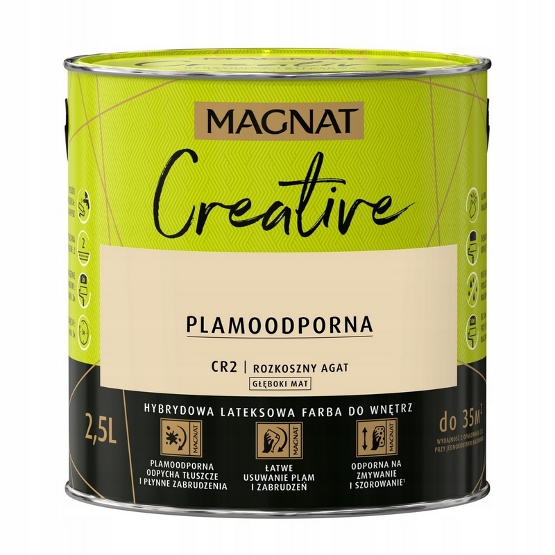 - MAGNAT CREATIVE to farba hybrydowa, łącząca ze sobą dwie właściwości: odporność na płynne zabrudzenia (hydrofobowość) oraz odporność na tłuszcze (oleofobowość). Farba przeznaczona jest do dekoracyjnoochronnego malowania ścian i sufitów z zapraw cementowych, cementowowapiennych, gipsowych, cegły, płyt gipsowokartonowych, drewnianych, drewnopochodnych oraz tapet, również tych z włókna szklanego użytkowanych wewnątrz pomieszczeń.