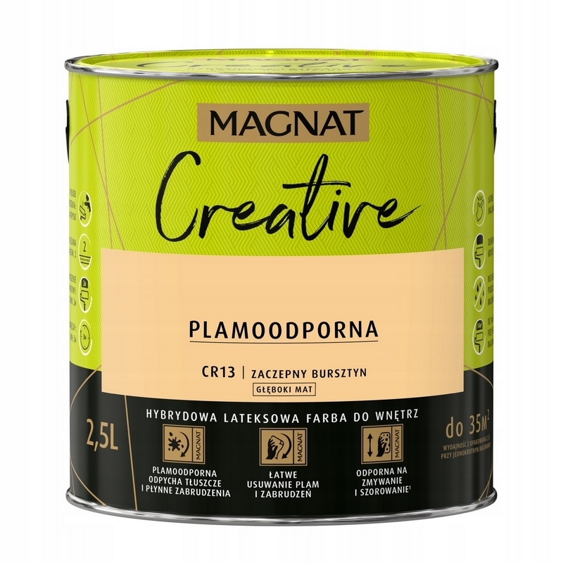 - MAGNAT CREATIVE to farba hybrydowa, łącząca ze sobą dwie właściwości: odporność na płynne zabrudzenia (hydrofobowość) oraz odporność na tłuszcze (oleofobowość). Farba przeznaczona jest do dekoracyjnoochronnego malowania ścian i sufitów z zapraw cementowych, cementowowapiennych, gipsowych, cegły, płyt gipsowokartonowych, drewnianych, drewnopochodnych oraz tapet, również tych z włókna szklanego użytkowanych wewnątrz pomieszczeń.
