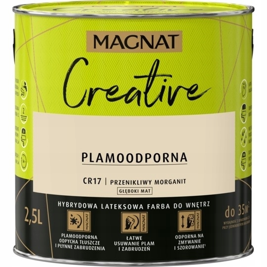 - MAGNAT CREATIVE to farba hybrydowa, łącząca ze sobą dwie właściwości: odporność na płynne zabrudzenia (hydrofobowość) oraz odporność na tłuszcze (oleofobowość). Farba przeznaczona jest do dekoracyjnoochronnego malowania ścian i sufitów z zapraw cementowych, cementowowapiennych, gipsowych, cegły, płyt gipsowokartonowych, drewnianych, drewnopochodnych oraz tapet, również tych z włókna szklanego użytkowanych wewnątrz pomieszczeń.