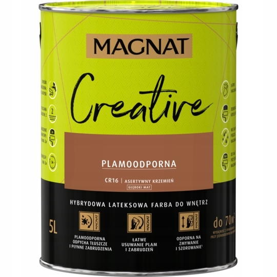 MAGNAT CREATIVE to farba hybrydowa, łącząca ze sobą dwie właściwości: odporność na płynne zabrudzenia (hydrofobowość ) oraz odporność na tłuszcze (oleofobowość). Głęboko matowe wykończenie podkreśla głębię koloru, ale oznacza również antyrefleksyjność farby. Farba przeznaczona jest do dekoracyjno-ochronnego malowania ścian i sufitów z zapraw cementowych, cementowo-wapiennych, gipsowych, cegły, płyt gipsowo-kartonowych, drewnianych, drewnopochodnych oraz tapet, również tych z włókna szklanego użytkowanych wewnątrz pomieszczeń.
