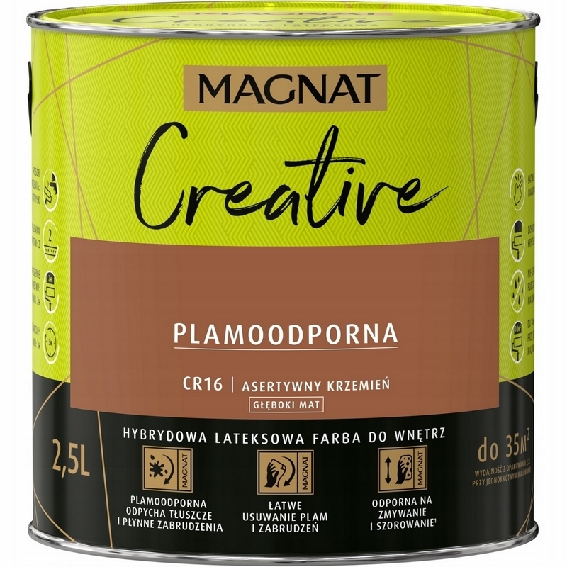 MAGNAT CREATIVE to farba hybrydowa, łącząca ze sobą dwie właściwości: odporność na płynne zabrudzenia (hydrofobowość ) oraz odporność na tłuszcze (oleofobowość). Głęboko matowe wykończenie podkreśla głębię koloru, ale oznacza również antyrefleksyjność farby. Farba przeznaczona jest do dekoracyjno-ochronnego malowania ścian i sufitów z zapraw cementowych, cementowo-wapiennych, gipsowych, cegły, płyt gipsowo-kartonowych, drewnianych, drewnopochodnych oraz tapet, również tych z włókna szklanego użytkowanych wewnątrz pomieszczeń.