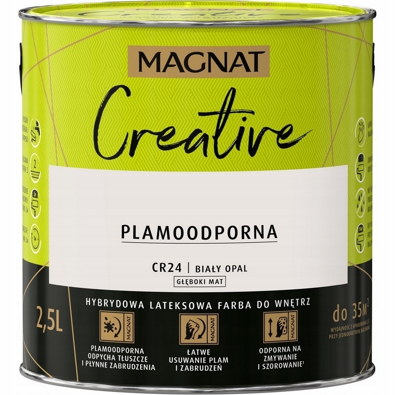 MAGNAT CREATIVE to farba hybrydowa, łącząca ze sobą dwie właściwości: odporność na płynne zabrudzenia (hydrofobowość ) oraz odporność na tłuszcze (oleofobowość). Głęboko matowe wykończenie podkreśla głębię koloru, ale oznacza również antyrefleksyjność farby. Farba przeznaczona jest do dekoracyjno-ochronnego malowania ścian i sufitów z zapraw cementowych, cementowo-wapiennych, gipsowych, cegły, płyt gipsowo-kartonowych, drewnianych, drewnopochodnych oraz tapet, również tych z włókna szklanego użytkowanych wewnątrz pomieszczeń.