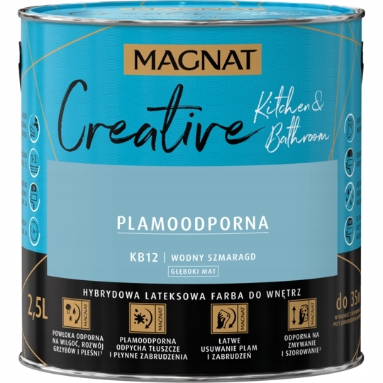 MAGNAT CREATIVE Kitchen&Bathroom to farba hybrydowa, łącząca ze sobą dwie właściwości: odporność na płynne zabrudzenia (hydrofobowość) oraz odporność na tłuszcze (oleofobowość). Głęboko matowe wykończenie podkreśla głębię koloru, ale oznacza również antyrefleksyjność farby. Farba polecana jest szczególnie do dekoracyjno-ochronnego malowania ścian i sufitów wewnątrz pomieszczeń narażonych na okresowo zwiększające się zawilgocenie i kondensację pary wodnej, jak: łazienki, pralnie czy kuchnie. Przeznaczona jest do dekoracyjno-ochronnego malowania ścian i sufitów z zapraw cementowych, cementowo-wapiennych, gipsowych, płyt gipsowo-kartonowych,