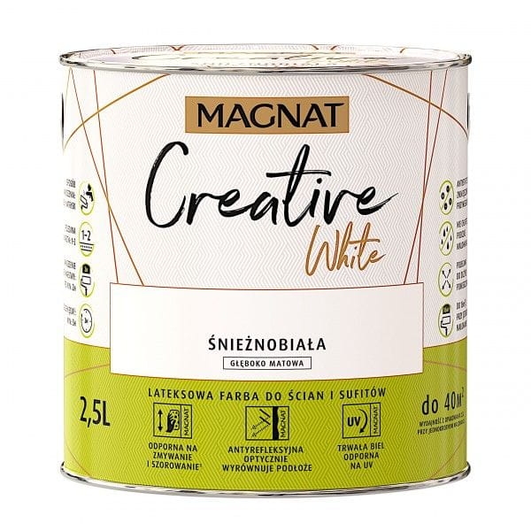 MAGNAT Creative White to lateksowa, głęboko matowa i antyrefleksyjna farba polecana do malowania dużych powierzchni. Antystatyczna powłoka farby zmniejsza efekt przywierania kurzu do ścian. Farba nie chlapie podczas malowania i charakteryzuje się bardzo dobrą przyczepnością do podłoża.