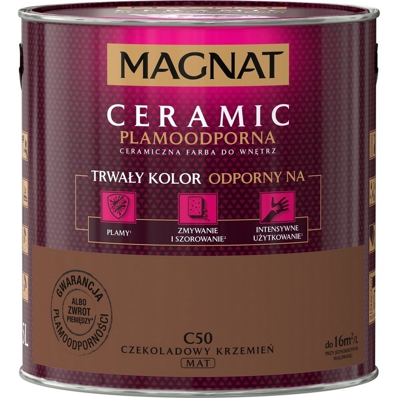to plamoodporna farba ceramiczna, stworzona na bazie najwyższej jakości żywic i pigmentów z myślą o najbardziej wymagających odbiorcach. Charakteryzuje się ponadprzeciętną odpornością na szorowanie i wielokrotne zmywanie. Powłoki nie absorbują trudnych zabrudzeń oraz są odporne na środki dezynfekujące. Produkt zapewnia doskonałe krycie i wydajność, nie chlapie podczas malowania. MAGNAT Ceramic zapewnia trwałe kolory odporne nawet na intensywną eksploatację i „trudne” plamy, takie jak: ketchup, olej słonecznikowy, pisaki wodne, kredki, szminka, musztarda (usunąć do 1 godziny), kawa, herbata, wino (usunąć do 15 minut) 1. Powłoki farby można zmywać i szorować na mokro2, również przy użyciu niektórych dezynfektantów3. ¹ Badania przeprowadzono po 28 dniach na gładkich, wysezonowanych podłożach dla wymienionych rodzajów plam po upływie wskazanych czasów. Producent zapewnia efekt plamoodporności¹ na gładkich powierzchniach.