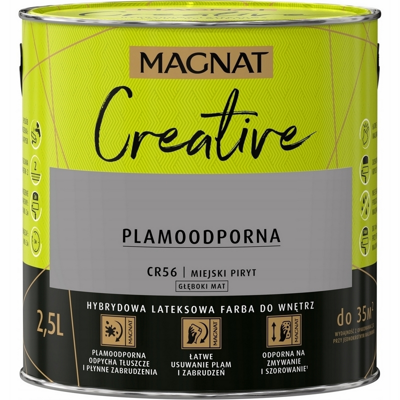 MAGNAT CREATIVE to farba hybrydowa, łącząca ze sobą dwie właściwości: odporność na płynne zabrudzenia (hydrofobowość ) oraz odporność na tłuszcze (oleofobowość). Głęboko matowe wykończenie podkreśla głębię koloru, ale oznacza również antyrefleksyjność farby. Farba przeznaczona jest do dekoracyjno-ochronnego malowania ścian i sufitów z zapraw cementowych, cementowo-wapiennych, gipsowych, cegły, płyt gipsowo-kartonowych, drewnianych, drewnopochodnych oraz tapet, również tych z włókna szklanego użytkowanych wewnątrz pomieszczeń.
