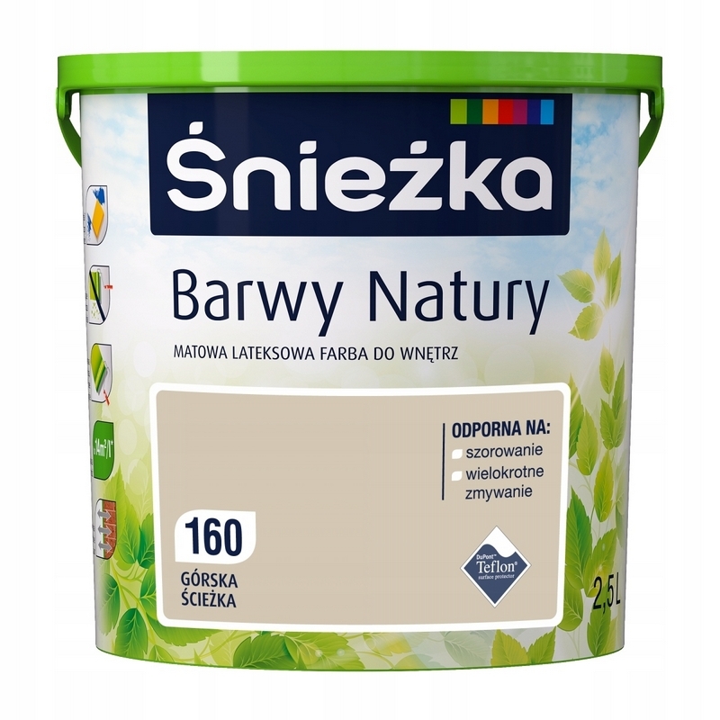 Zawarty w Śnieżce BARWY NATURY Teflon zapewnia wysoką trwałość wymalowań, ułatwia czyszczenie, usuwanie plam i zabrudzeń,