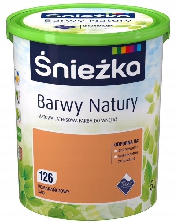 Zawarty w Śnieżce BARWY NATURY Teflon zapewnia wysoką trwałość wymalowań, ułatwia czyszczenie, usuwanie plam i zabrudzeń,